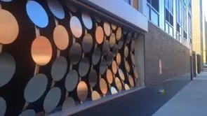 We received a sculptural commission for this luxury residential building in Williamsburg. We were asked to provide custom metal fabrication that would serve as both a sculptural screen and a security barrier for the ground floor parking level. This massive building spans an entire city block and appears so imposing and heavy that the architect described it as a “battleship.” We lightened up the immense structure by creating “The Waves,” an original art piece fabricated from individual reflective discs that pull in light and other elements from the immediate neighborhood and constantly change as the viewer’s vantage point changes.