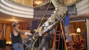 Grand Staircase, Exterior Facial Panels, Center Ceiling, Light Fixture, Glass Guardrails–Bronze, glass, black walnut